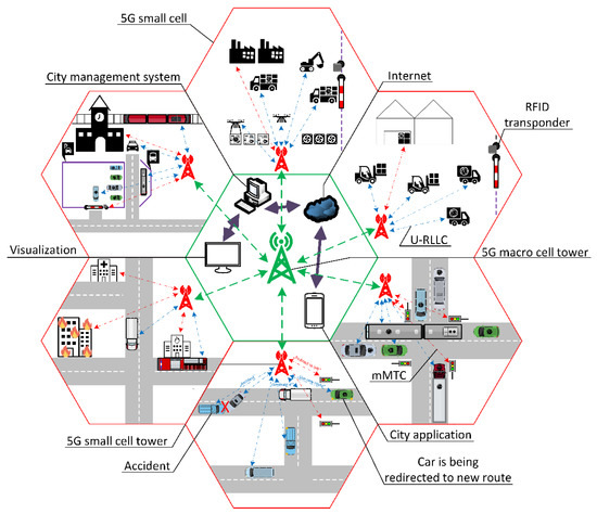 The urban infrastructure related to traffic that uses the 5G communication together with the RFID technique is presented in Figure 2. In the central part, there is a city traffic management center with visualization stations for operators and a mobile application for citizens. Data sources, including moving vehicles, RFID readers in road infrastructure, special purpose vehicles, and more, are located in the surrounding circle. 5G infrastructure connects objects from the central and external parts of Figure 2.