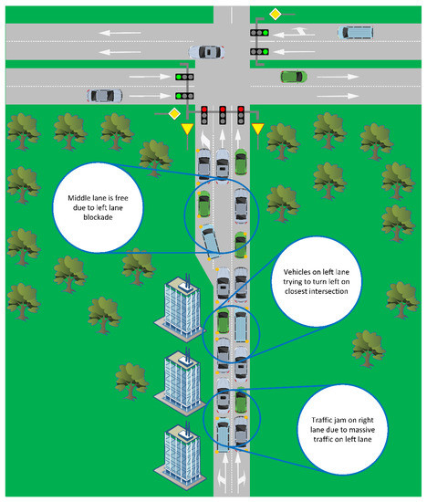 An example of a crossing of a one-way street with a dual carriageway is shown in Figure 3. The one-way road contains three directional lanes with two lanes straight ahead and another one for the left turn. This solution may cause traffic jams at rush hour, especially if the intersecting streets lead to and from the city. For example, it creates a scenario where the lanes in one direction are less loaded but still have the same amount of green light as the lanes with a greater load. In the situation illustrated in Figure 3, most of the vehicles in the left lane are preparing to turn left at the nearest intersection. As it is only a short lane and there are many vehicles, the green light time may not be enough to keep the intersection from jamming.