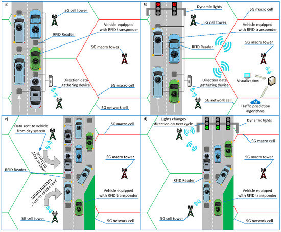 The operation of the proposed system will be presented using Figure 4 divided into parts (a–d), where vehicles drive forward in two or three lanes. The vehicles have RFID transponders embedded during production or mounted as stickers. RFID readers are installed inside the road infrastructure and connected to the device collecting the RFID data from vehicles on each lane (Figure 4a). RFID transponders contain all the important data related not only to the vehicle characteristics, but also to information on how the driver should drive to reach the destination from the starting point. The solution assumes that vehicle-to-infrastructure (V2I) communication takes place via 5G. The collector device forwards the data acquired from the RFID readers to the traffic management center via the nearest 5G cell tower (Figure 4b). The system analyzes traffic data in real time and forecasts the traffic volume at the nearest intersections. Consequently, the system is able to manage the change of traffic lights depending on how many vehicles are in a certain lane. The driver receives feedback from the city management control system via an on-board equipment inside the vehicle, such as a navigation or driving assistant (Figure 4c), which signals the established traffic arrangement (Figure 4d).