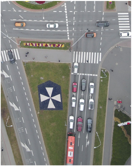 To illustrate the principle of the adopted model, simulations were carried out with the use of real traffic data obtained on the basis of drone observations of vehicle flow at several intersections in Rzeszów, PL (Figure 5). Two intersections will be considered here: the first with three lanes and the second with two lanes but with uphill traffic.