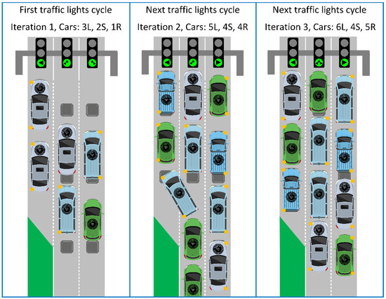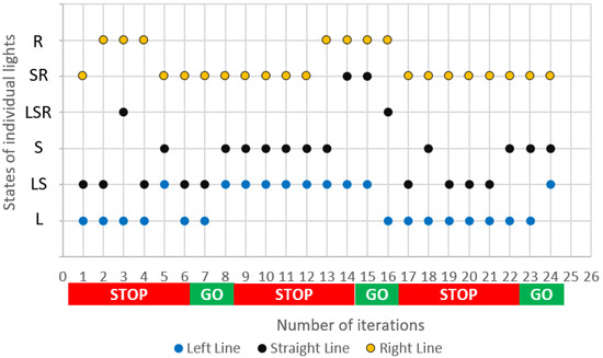 Each of the phases was divided into iterations. Six iterations were distinguished for the Stop phase and two iterations for the Go phase. Table 1 presents the assumptions of one of the simulations performed. The adopted values correspond to the registered traffic intensity of vehicles at one of the intersections in Rzeszów. The possible states are marked as follows: L (left), LS (left-straight), S (straight), LSR (left-straight-right), SR (straight-right), and R (right). Of course, particular can assume states from the set permissible for themselves.