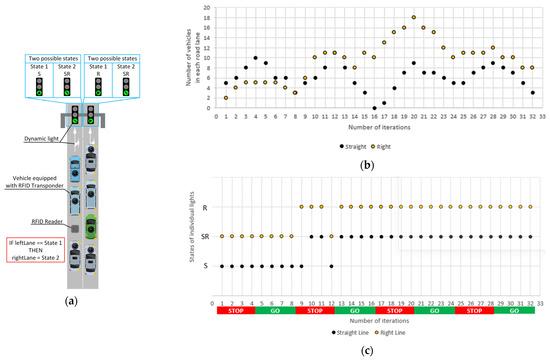 The second case under investigation is an intersection with two lanes that may allow straight-ahead and right-turn respectively shown in Figure 9a. In this case, each of the individual lanes can be in two states: basic and alternative, while for each lane, these states are different, i.e., for the first one, the basic state is driving straight ahead (S), and for the second, to the right (R). The alternate state for both lanes is driving straight ahead and right (SR). Due to the fact that the simulation corresponded to a real intersection with only one cross road on the right, the same number of iterations of four for the Stop phase and the Go phase was taken into account. Additionally, the actual intersection is located on a slight elevation, which means that the number of cars leaving the intersection in each iteration of the Go phase is smaller than for the intersection shown in Figure 6.