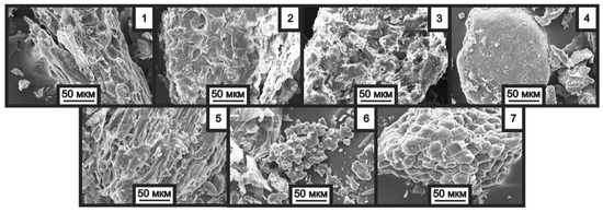 Figure 7 presents the results of scanning electron microscopy of the particles of the biochar samples.