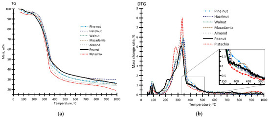 As can be seen in Figure 3b, the DTG profiles are bimodal in shape. The first maximum on the DTG curves can be attributed to the moisture removal (up to 5.4 wt% at 130 °C), and the second one (at 180–570 °C) is due to sublimation and removal of volatile compounds. It should be noted that, for the pistachio, peanut, and macadamia shell samples, the DTG curves are slightly different, which is associated with the formation of additional reflections at different temperatures. In general, the process of thermal conversion of the samples, in this temperature range, can be due to the decomposition of the main structural components of the biomass: hemicellulose (200–370 °C), cellulose (275–400 °C) and, to a lesser extent, lignin (above 400 °C) [25]. Thus, the main peak (290–400 °C) is mainly due to the pyrolysis of cellulose (Δm = 8.7–11.9 wt%), and the shoulder peak (210–275 °C) can be attributed to thermal decomposition of hemicellulose (Δm = 8.7–11.9 wt%). Residual decomposition of lignin at 400–570 °C was about 6.9–11.1 wt%. The obtained residue consisted of carbon and ash.