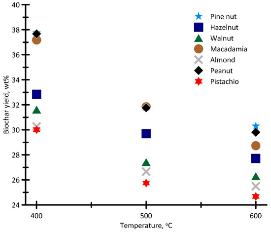 A negligible change in the biochar yield could be observed as the heating medium temperature increased from 500 °C to 600 °C. Thus, for the samples of almond, pistachio, walnut, and pine nut shells, Tg increased from 500 °C to 600 °C and changed the biochar yield by about 0.9%. For the macadamia and hazelnut shell samples, the change in the biochar yield was more significant and amounted to about 3.0 wt%.