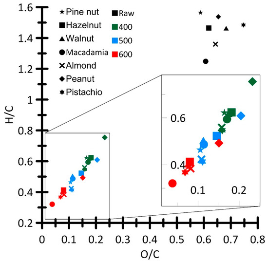 The maximum LHV value (about 32.7 MJ/kg) was observed for the samples derived from macadamia, hazelnut, and walnut shells at the heating medium temperature of 600 °C. In this case, the maximum carbon content (Cd = 89.8 wt%) was observed for sample M600. In turn, the minimum values of LHV (27.2–29.7 MJ/kg) and C (66.8–73.1 wt%) were found for the biochar samples obtained from peanut shells, which is due to a high ash content (Ad = 6.8–7.7 wt%).