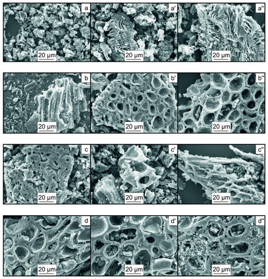 SEM images of the particles of the biochar samples: (a,a′,a″)—Pine400, Pine500, Pine600; (b,b′,b″)—H400, H500, H600; (c,c′,c″)—W400, W500, W600; (d,d′,d″)—M400, M500, M600; (e,e′,e″)—A400, A500, A600; (f,f′,f″)—Pean400, Pean500, Pean600; (g,g′,g″)—Pist400, Pist500, Pist600 (×1000).