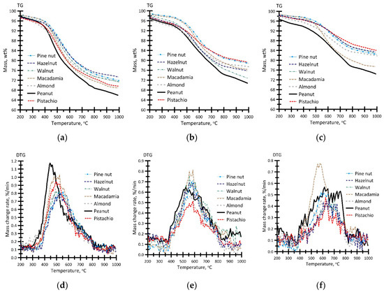 It could be seen that, with an increase in the pyrolysis temperature, the activation energy had been increasing, which was in correlation with the change in volatile compounds content in the studied samples (Table 3). This was the case of the shift of TG profiles to a higher temperature region (Figure 8 and Figure 9). Differences in the activation energy values for conversion processes in an inert and oxidizing mediums were associated with incomplete decomposition of the sample in an inert environment during pyrolysis. Generally, the activation energy values for biochar conversion in both inert and oxidative mediums had been increasing with temperature of biochar obtaining. It may be caused by more complete conversion of biochar during raw material pyrolysis at higher temperature. The highest reactivity in an inert medium was observed for pistachio biochar sample, and in an oxidative medium—for walnut and peanut biochar samples. The highest activation energy values were almost on par with several other samples, thus making the clear choice of a biochar sample with lowest reactivity almost impossible.