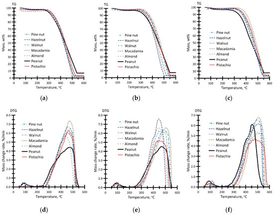 TG (a–c) and DTG (d–f) curves for the process of thermal decomposition of the biochar samples produced at different temperatures: (a,d)—400 °C, (b,e)—500 °C, (c,f)—600 °C. Argon flow rate—150 mL/min, heating rate—10 °C/min, sample weight ≈ 15 mg.
