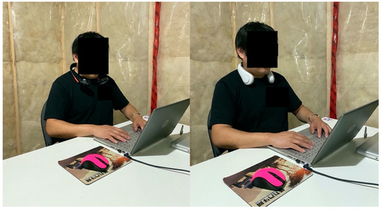 In order to investigate the actual performance of energy-efficient wearable cooling fans on the improvement of occupant thermal comfort in warm indoor conditions, two commercially available wearable U-shaped cooling fans were chosen: a face cooling fan and a neck cooling fan (see Figure 1). The face cooling fan (Gusgu, Shenzhen Gushang Digital Co., Ltd., Shenzhen, China) generates airflow by using two brushless 360° rotating direct current axial fans and can be worn around the neck. The two axial fans have a diameter of 7.5 cm and they can be controlled at three different speeds. This wearable face cooling fan has a built-in rechargeable lithium battery with a capacity of 2000 mA·h (7.4 W·h, voltage: 3.7 V) that can be recharged via USB. The cooling duration varies depending on the speed level (air speed ranged from 2.20–4.00 m/s at levels 1–3 [measured with an anemometer at a distance of 10 cm]). The total aerodynamic noise produced by the two axial fans in the facial cooling fan when operating at maximum fanning speed was determined to be 70.1 dB. Hence, the quality of the facial cooling fan is ‘Good’ based on the machine vibration nomogram. The face cooling fan’s total power and weight are 4.0 W and 220 g, respectively. Two 5-cm (diameter) brushless direct current centrifugal fans were used for the wearable neck cooling fan (Gusgu WT-F41, Shenzhen Gushang Digital Co., Ltd., Shenzhen, China). The air produced by the two centrifugal fans is expelled through 76 tiny vents located along the U-shaped air ducts. This type of neck cooling fan is powered by a rechargeable lithium battery and the cooling duration with a capacity of 2400 mA·h (8.9 W·h, voltage: 3.7 V) and has a cooling duration of 3–16 h. This neck cooling fan, similar to the wearable face cooling fan, has three air speed settings (averaged air speed at the outlets was 1.15–3.25 m/s at speed levels 1–3). The total noise produced by the two centrifugal fans in the neck cooling fan when operating at maximum fanning speed was determined to be 62.8 dB. Hence, the quality of the neck cooling fan is ‘Good’ based on the machine vibration nomogram. The neck cooling fan’s total power and weight are 3.7 W and 260 g, respectively.