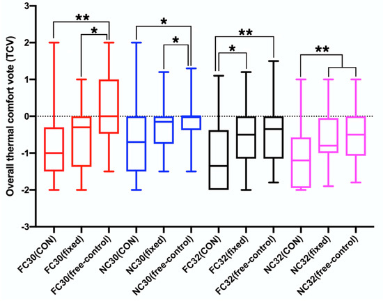 Overall thermal comfort votes (TCVs). *, p < 0.05; **, p < 0.001.