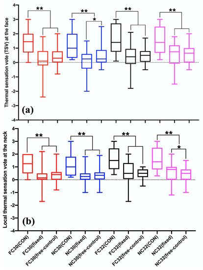 When no cooling was applied, mean local TSVs at the neck ranged between +1.19 and +1.62 (close to ‘Slightly warm’) (see Figure 5b). Both cooling fans reduced local TSVs at the neck area by more than 0.82 scale unit. Local TSVs at the neck were +0.29, +0.43, +0.24 and +0.36 (all values were close to ‘Neutral’) in FC30(fixed), FC30(free-control), NC30(fixed) and NC30(free-control), respectively. Similarly, local TSVs) at the neck in FC32(fixed), FC32(free-control), NC32(fixed) and NC32(free-control were +0.55, +0.44, +0.52 and +0.37 (in between ‘Neutral’ and ‘Slightly warm’), respectively. As a result, the neck cooling fan may induce greater improvement on local TSVs at the neck than the face cooling fan. At 32 °C only, the free-control mode had significantly lower TSVs at the neck than the fix-power mode (p < 0.05).