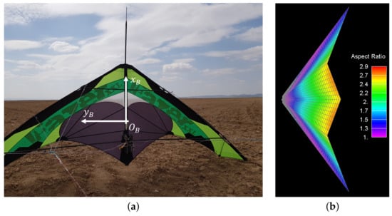 (a) shows the RFD kite (HQ Fazer XXL) during the experimental campaign. (b) displays the aerodynamic mesh of the VLM model. The color bar represents the aspect ratio of the mesh panels.