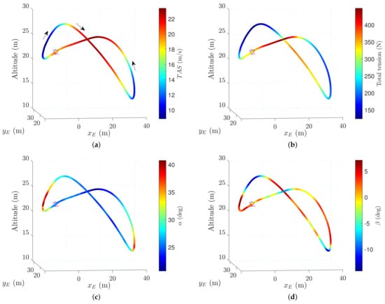 Trajectory of the kite in the selected maneuver. The color in (a–d) correspond to the true airspeed, the total tension on the two tethers, the angle of attack and the sideslip angle, respectively. The upward red triangle and the downward blue triangle are the starting and final points and the arrows in (a) show the direction of the kite motion.
