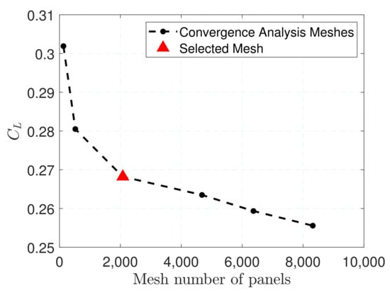 The VLM requires a lattice-like mesh composed of flat panels (see Figure 1). The kite geometry was split into four surfaces, two of them on each side of the symmetry plane. Each of these surfaces was discretized using quadrilateral elements. To guarantee a high-quality mesh, the elements aspect ratio, i.e., the fraction between the sides of the panel was bounded below 3. Consequently, and since the four surfaces become tapered toward the Leading Edge (LE), a graded mesh was obtained. Figure 3 shows a convergence analysis by varying the number of panels and monitoring relevant aerodynamic outputs of the tool, such as the lift coefficient for steady conditions at and . Hereafter, we consider a mesh with 2080 panels because, as shown in Figure 3, it has a good balance between computational cost and accuracy. Its error for the is less than 5% as compared with the finest mesh considered in Figure 3. For the selected mesh, the computational time for one time step in an unsteady simulation is in the order of a second.
