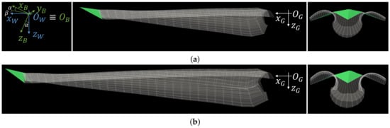 UnPaM has a module that is used to prescribe any relative motion between the kite and the fluid. This module is purely kinematic and not dynamic, i.e., aerodynamic loads are computed as the result of the motion defined by the user. The two relevant frames of reference in the simulations are the wind (identified by index W) and the body (identified by index B) frames, both of them with origin at the center of mass of the kite. The former has the -axis along the aerodynamic velocity vector whereas the -axis lies on the plane of symmetry of the kite and points towards the ground in normal flight conditions. Axis completes the right-handed frame. For convenience, we introduce a third frame, called the global frame (identified by index G), that has axes parallel to the wind frame and is at rest with respect to the computational box, i.e., everything else moves with respect to this frame. Therefore, the origin of the wind and the body frames move at the along the -axis.