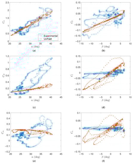 This section compares the force and moment coefficients predicted by UnPaM and the one obtained by feeding the Extended Kalman Filter with the data measured in the experimental campaign [28]. The selected trajectory is the figure-of-eight shown in Figure 2. Figure 5 shows the six force and moment coefficients. Longitudinal (, , and ) and lateral-directional (, , and ) coefficients are presented versus the angle of attack and the sideslip angle, respectively. Dots and crosses are used to show the results obtained from UnPaM and the experiments.