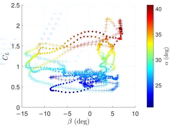 Lift coefficient (crosses and points for experimental and UnPaM data, respectively) versus the sideslip angle with colormap for values.