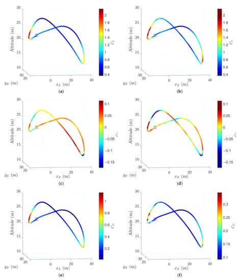 Figure 7 shows the values of the force coefficients along the figure-of-eight trajectory. Experimental and numerical results are shown on the left and the right figures. To ease the comparison, the limits of the scale were set evenly for each pair of plots, except for the drag coefficient in Figure 7e,f. The general trend of the three force coefficients correlates reasonably well along the orbit. It also makes evident the very different conditions reached by the kite in the straight legs and the turning phases. The lift (Figure 7a,b) and drag (Figure 7e,f) coefficients reach their maxima in the turns where, eventually, the (Figure 2) finds its minimum. The kite reduces its in the turns, but its angle of attack increases to yield a high and . The opposite situation happens in the straight legs, where the is large and the angle of attack and the force coefficients are small. This explains the high values of the tether tensions shown in Figure 2. The lateral force coefficient (Figure 7c,d) mainly follows the sideslip angle and it changes its sign along the trajectory.