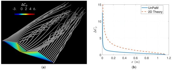 Figure 8 shows the results of UnPaM for , and m/s, which are the typical conditions found during the figure-of-eight maneuver. UnPaM, which is a potential flow code, may work properly for these conditions because we checked that the zero-lift line is at an angle of attack of . As explained in Section 2.2.2, the angle of attack is measured with respect to the spine of the kite in our analysis. The color in Figure 8a indicates the difference of the pressure coefficient between the intrados and extrados (). A very different behavior is observed at the two planes closer to the spine of the kite than in the two other planes that contain the leading edge because these two families of planes have a very different dihedral angle. Consequently, the coefficient is positive in the inner part of the kite and negative at the leading edge for this specific angle of attack. The maximum is reached at the two diagonals where the planes intersect. These 3-dimensional results have been compared with the of a 2-dimensional flat plate. Figure 8b shows the distribution of along the spine of the kite from UnPaM and Equation (13) of ref. [39] that reads