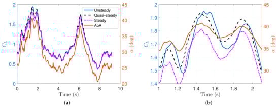 In order to obtain an idea of the unsteady effects in the flight of the RFD kite, we present now three different types of results: (i) unsteady results obtained by implementing the methodology explained in Section 2.2, (ii) quasi-steady results obtained such as in (i) but ignoring the second term in Equation (8) and eliminating the roll-up of the wake by forcing the geometry of its panels, and (iii) steady results obtained such as in (ii) but setting . Figure 9a shows the lift coefficient of the three approaches versus time (left axis) and, for convenience, it also displays the evolution of the angle of attack (right axis) in the figure-of-eight trajectory. The three approaches give the same results for the straight legs of the figure of eight, where the angle of attack and the angular velocity are small and the is high. The main differences occur during the turns, as shown in the detail provided in Figure 9b. The steady approximation mostly underestimates the value of . Interestingly, there exists a lag between the and in the unsteady approximation. The maxima of the in the unsteady approximation occurs later than the maxima of the angle of attack. Regarding the steady and the quasi-steady approximations, the maxima of the and the curves occur simultaneously. Even during the turning, the differences are small and a steady or a quasi-steady simulation may suffice for the aerodynamic modeling of RFD kites flying in crosswind trajectories.