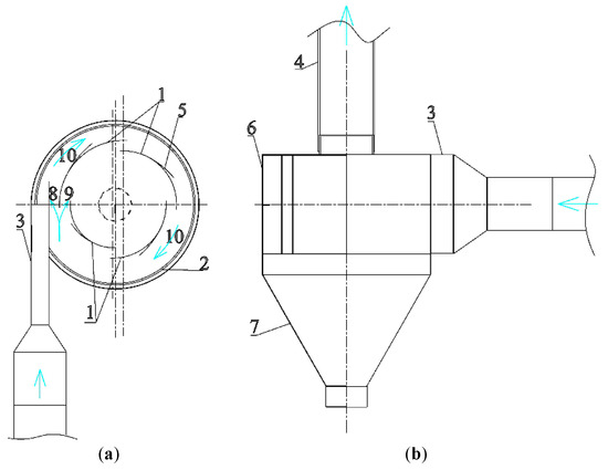 Multi-channel single-inlet cyclone (a) top view and (b) side view: 1—internal curved quarter-ring elements with openings cut, 2—ringed continuous slit, 3—a single inflow, 4—cleaned air outflow, 5—plates of quarter-rings, 6—cyclone separation chamber, 7—conical hopper, 8, 9—peripheral and transitional distribution flows, 10—circulating airflow in the cyclone’s channels.