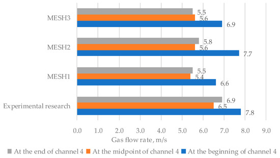 The modeling and experimental research [29] allowed the researchers to determine the gas flow rate distribution in channel 4. The highest errors made in modeling are found at the last points, which are considered [28]. For this purpose, the rates of the gas flows obtained in the experimental research and modeling have been analyzed and the results of their comparative analysis are presented (Figure 4).