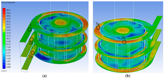 The distribution of gas flow rates in the separation chamber of the multi-channel cyclone separator at the heights of 5 cm (point 2b), 15 cm (point 2a), and 25 cm (point 1), front (a) and back (b) views for obtaining an overall 360° angle view, the end sections of the first (point 3b) and the second (3a) channels.