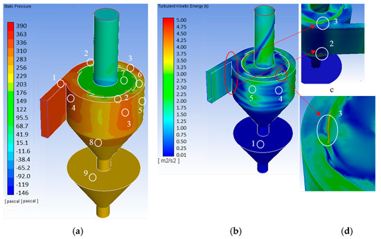 The distribution of the gas flow’s static pressure (a) and the kinetic energy of the turbulence (b) along the walls of the multi-channel cyclone’s separation chamber; (c) is the gas flow inlet and the detailed representation of the cyclone channel 1; (d) is a detailed representation of the gas flows’ redistribution near the inlet to channel 3 of the cyclone; the area at the beginning of the channel (point 1), the midpoint of channel 1 to the end of channel 4 (point 2), at the beginning of each channel (point 3), at the beginning of channel 2 and at the end of the channel 4 (point 4), in the middle of channel 3 (point 5), the top cover of the separation chamber in channels 2 and 3 (point 6), in the central internal channel (point 7), the area of the first cone-shaped part (point 8), the second (lower) cone-shaped part (point 9).