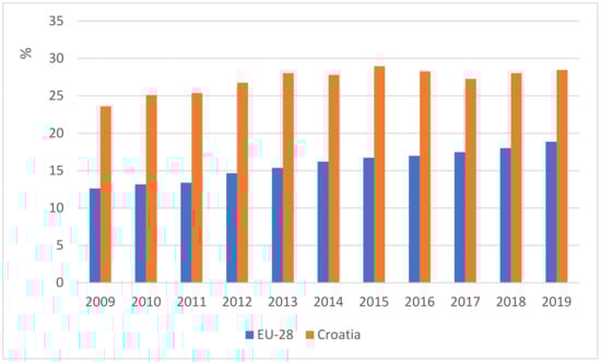 Overall share of energy from RES for EU-28 and Croatia, 2009–2019. Source: Authors’ elaboration based on [].
