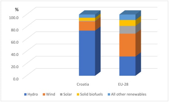Renewable energy sources (RES) will play a key role in achieving the EU’s energy and climate objectives. According to Directive 2009/28/EC [], “energy from renewable sources means energy from renewable non-fossil sources, namely wind, solar, aerothermal, geothermal, hydrothermal and ocean energy, hydropower, biomass, landfill gas, sewage treatment plant gas and biogases.” There is scientific and general political understanding that the consumption of fossil fuels must be eliminated to mitigate and stop climate change. RES are available within the EU and are cost-competitive with fossil fuels. Across the EU, the share of renewable energy in gross final energy consumption has increased in recent years from 12.6 percent in 2009 to 18.8 percent in 2019 []. The five EU countries with the largest share of their energy coming from RES (based on 2019 Eurostat data) are Sweden (56.4 percent), Finland (43.1 percent), Latvia (41 percent), Denmark (37.2 percent), and Austria (33.6 percent). In Croatia, the share of RES in gross final energy consumption has increased from 23.6 percent in 2009 to 28.5 percent in 2019 [].
