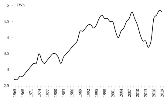 Italian Railways traction energy consumption between years 1965–2019 (TWh).