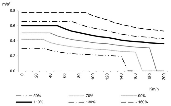 Standard deceleration values are reported in Figure 4 for different braked mass (%).