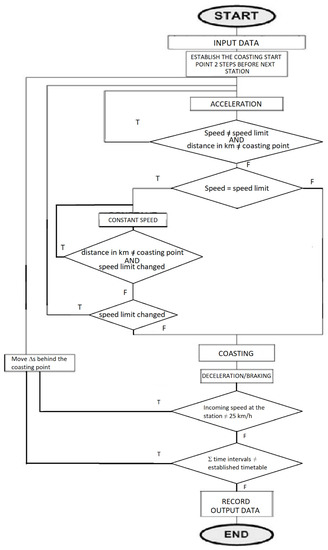 The coasting starting point is fixed by the railway company management according to the network route times. In each section arriving at the next station, on either flat or downhill tracks, the algorithm increases the distance covered in coasting until the maximum time set is reached; in this way, the point at which coasting starts is automatically calculated. According to Italian laws, 300 m before the next station the speed must be set at a maximum value of 25 km/h, and kept for 200 m before starting to brake in order to stop at the station. The software sets a tentative coasting start point 500 m before the station, and moves this point behind by steps of Δs = 100 m if any condition is not satisfied.