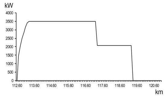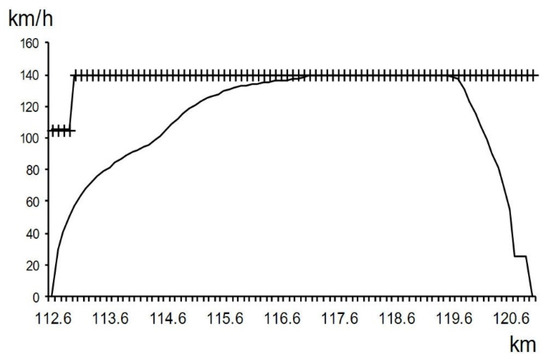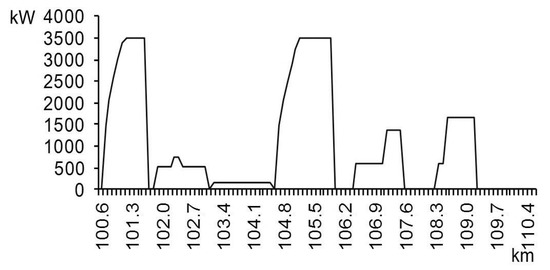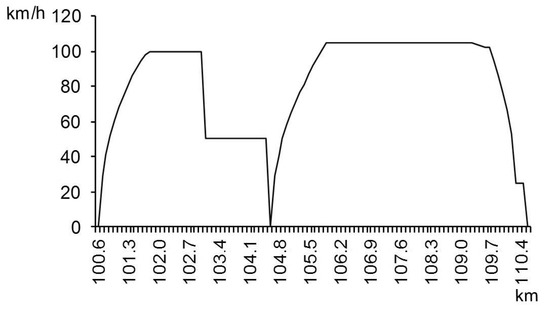 The numerical values of the train speed and the absorbed electrical power of Figure 7 and Figure 8, respectively, correspond very well with the speed registrations kindly provided by the railway company.