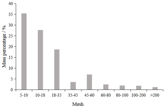 The pulverised coal that was used in this experiment came from the Huainan mining area in Anhui Province, China. The tectonic coal that was sampled underground was screened in order to obtain its particle size distribution (calculated by mass percentage), as shown in Figure 1.
