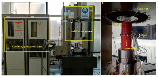 This study used the MTS815 test system for rock mechanics from the State Key Laboratory for Geomechanics and Deep Underground Engineering, China University of Mining and Technology, Xuzhou, China, as shown in Figure 4. The equipment consisted of three parts, including loading, testing, and control systems. The equipment could be used for loading and unloading testing under multiple control modes of force, stress, displacement, and strain. The rigidity of the test machine was 10.5 × 109 N/m, the maximum axial load could reach 1700 kN, the confining pressure was lower than or equal to 45 MPa, and the limiting data acquisition frequency was 2 × 104 times per second.