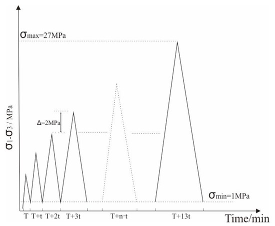 Triaxial cyclic loading and unloading procedures taking place under stress gradients were conducted in this test, with a confining pressure of 12 MPa. The axial upper limit of stress increased by 2 MPa per gradient and the lower limit of axial deviatoric stress remained constant at 1 MPa (as Figure 5). The cyclic loading and unloading was performed at different rates (0.05 MPa/s, 0.1 MPa/s, 0.15 MPa/s, 0.2 MPa/s, and 0.25 MPa/s) and the corresponding samples were named NO. i (i = 1,2,3,4,5, respectively).
