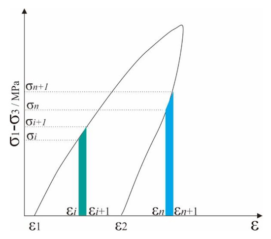 where ε1 and ε2 indicate the strains that were apparent when the stress σ equalled σmin in loading and unloading processes; and εmax denotes the strain when the stress σ equalled σmax on the loading curve. Moreover, εi, εi+1, εn, and εn+1 indicate the strains at an integral step, while σi, σi+1, σn, and σn+1 denote the stresses at an integral step. The units of ε and σ are “ [-]” and “MPa”, respectively.