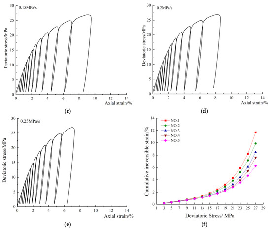 Deviatoric stress–strain curves. (a) Stress–strain curve of NO. 1, (b) Stress–strain curve of NO. 2, (c) Stress–strain curve of NO. 3; (d) Stress–strain curve of NO. 4, (e) Stress–strain curve of NO. 5, (f) Cumulative irreversible strain of all samples.