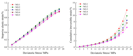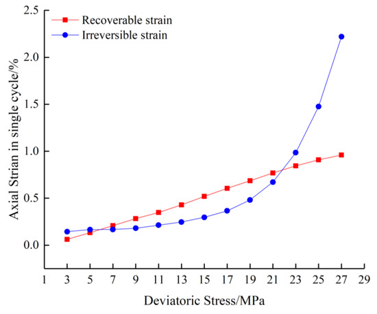 As described in the previous section, the characteristics of the stress–strain curves of all of the samples were consistent. The NO. 4 specimen was taken as an example to illustrate the changing laws of elastic strain and plastic strain in a single cycle, as shown in Figure 8. When the deviatoric stress was less than 5 MPa, the axial plastic strain was slightly higher than the elastic strain. This is because the original sample contained several voids, which compressed rapidly under the low axial stress that was applied during the compaction. As the voids were gradually compacted by deviatoric stress in the range of 7 MPa to 21 MPa, the elastic strain was greater than the plastic strain, therefore accounting for a higher percentage of the total strain. As the axial stress increased above 21 MPa, the growth rate of the plastic strain was much faster than that of the elastic strain. When the deviatoric stress increased from 21 MPa to 27 MPa, the plastic strain increased by 230%, while the elastic strain only increased by about 25%. Finally, the irreversible strain and elastic strain were measured at 2.22% and 0.96%. The sharp increase in the plastic strain that was observed in this stage was caused by the continuous expansion of secondary defects.