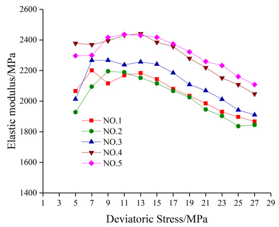 As presented in Figure 10, the elastic modulus evolution has the following characteristics: first, the voids were compressed during early loading and the elastic modulus increased gradually. Second, as the loading rate changed from slow to fast, the corresponding elastic modulus peaks were measured at 2.18 GPa, 2.20 GPa, 2.27 GPa, 2.44 GPa, and 2.44 GPa. Furthermore, the change curves of the elastic modulus under the different loading rates were approximately parallel. In the compaction stage, there was no obvious regularity in the elastic modulus change with the loading rate. Only after the elastic modulus approached the peak did it show a positive correlation with the loading rate. In addition, the elastic modulus experienced a rising period after which it reached the maximum value, then declined immediately when the loading rate was lower than 0.15 MPa/s. However, when the loading rate was higher than 0.15 MPa/s, the change in the elastic modulus could be divided into three stages. These were the rising stage, stable stage and decay stage. At the point at which the deviatoric stress reached 9 MPa, the elastic modulus was stable at about 2.42 GPa; that was until the deviatoric stress was 17 MPa, at which point the elastic modulus began to decrease gradually.