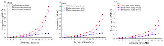 Furthermore, there was evidence that both ue, and ud increased slowly at the initial stage and the gap between them was not obvious. However, as the stress gradually increased, the plastic energy density began to increase rapidly and inflection points appeared in the 15 MPa, 17 MPa, and 19 MPa levels of deviatoric stress.