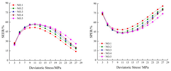 It can be seen from Figure 12 that increased with the increase in deviatoric stress in the first stage and then decreased with the increase in stress in the second stage; and that the demarcation point for the deviatoric stress became 11 MPa. In the first stage, had no obvious correlation with the loading rate, but it did have a significant positive correlation with the loading rate in the second stage. I.e., the higher the loading rate was, the higher the recoverable energy ratio. For example, for samples NO. 1, NO. 3, and NO. 5, the peak values of were 48.40%, 56.05%, and 57.16%, respectively. At the end of the experiment these values reached low points of 13.97%, 18.30%, and 26.18% respectively. The total strain energy density was equal to the sum of the plastic and elastic strain energy densities, so the change mechanism of the plastic strain energy ratio was not found to have been repeated.