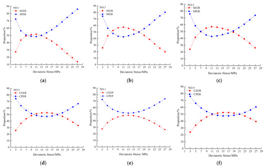 CEER and CPER evolution curves. (a) Stepwise strain energy ratio of NO. 1, (b) Stepwise strain energy ratio of NO.3, (c) Stepwise strain energy ratio of NO. 5; (d) Cumulative strain energy ratio of NO. 1, (e) Cumulative strain energy ratio of NO. 3, (f) Cumulative strain energy ratio of NO. 5.
