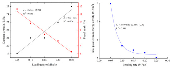 Through parallel comparisons of the total plastic strain energy density, upper limit damage strength and total strain, some results can be obtained. As presented in Figure 14, the damage strength and total strain had a linear relationship with the loading rate, with a unit growth factor of 40, −26.2 and a fitting degree of 0.926, 0.985. However, the relationship between the total plastic strain energy density and loading rate can be fitted by power function and the fitting coefficient was 0.981. Therefore, even though the natural inhomogeneity of the samples was taken into account, the increase in loading rate exhibited a significant influence on the inhibition of the growth of the total plastic strain density and plastic strain energy density.