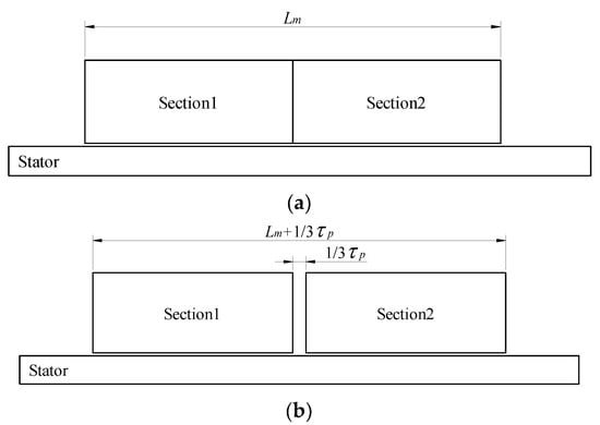 Recently, the authors of [,,,,,] have successfully proposed a new design technique that sectionalizes the mover into at least two sections and rearranges phase distribution in each section to ensure the maximum winding factor under any given pole–slot combination. This technique is simple and unusually effective for reducing the end effect. This methodology can be applied in a single-stator structure [,,,,] and in a double-stator structure [,,]. However, it still requires a skewing design or other design technique to reduce the cogging force component. Moreover, the skewing design typically sacrifices about 5% of the thrust.