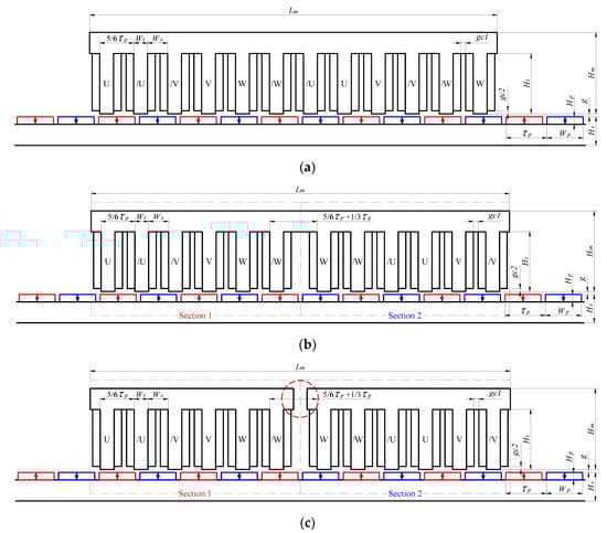The key idea of the teeth arrangement design suggested earlier is using supplementary angle relationships among the existing phases when spacing the sections apart [,,,]. For three-phase PMLSMs, the minimum span is preferably 60 (=1/3π) electrical degrees, which equals 1/3τp, as schematically shown in Figure 1b.
