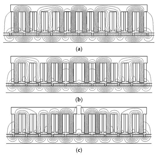 Flux line comparison: (a) Model 1: conventional design; (b) Model 2: proposed design; (c) Model 3: separated section design.