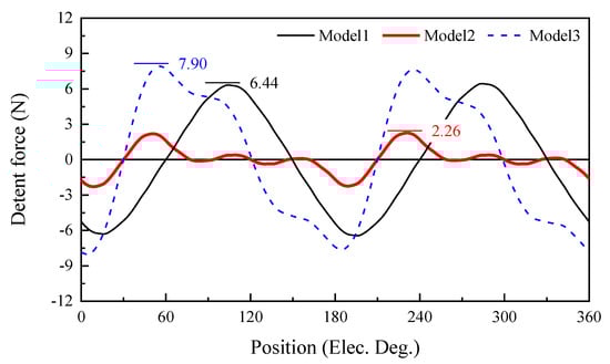 Figure 4 compares the detent force waveforms of all the models. It can be observed that Model 2 effectively reduces the peak value when compared to Model 1. In this comparison, it should be noted that Model 2 dramatically reduces the peak value by over 65%. However, the peak value of Model 3 increases when separating the sections physically, as shown in the red-dashed circle in Figure 2c. This is because this separation changes the inter-sectional magnetic flux flow and inversely affects the end-effect. The separation consequently leads to an increase in the peak value by 18% when compared to Model 1, as shown in Figure 4. Therefore, it should be carefully considered to avoid an undesired increase in the end-effect when implementing the proposed design.